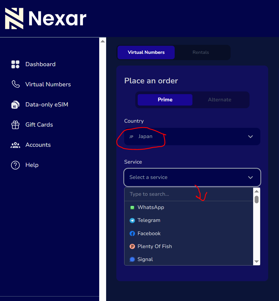 Go to the Virtual Numbers section and select Japan virtual number from the available countries.