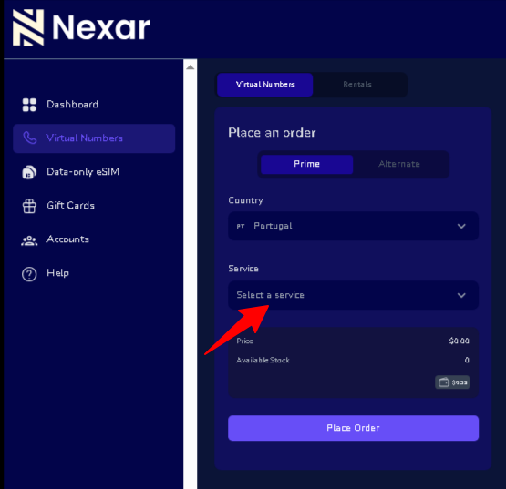 Go to the Virtual Numbers section and select Portugal from the list of available countries.