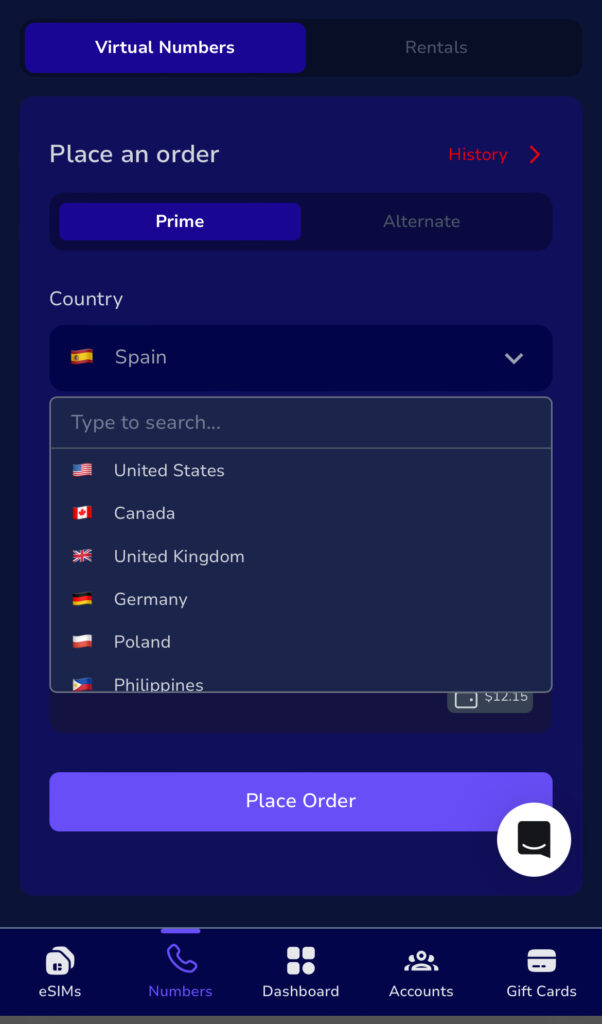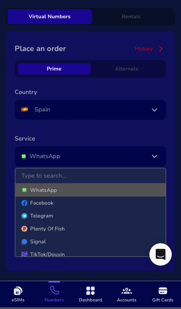 Inside the website, tap on Virtual Numbers and select Spain.