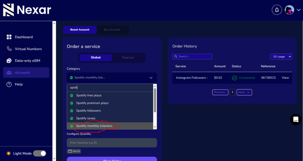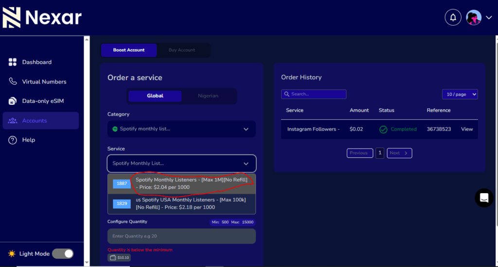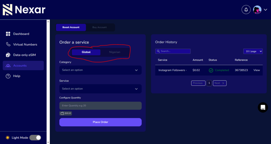 - From the boost account option, you can toggle between the “Global” and “Nigeria” Option as circled below