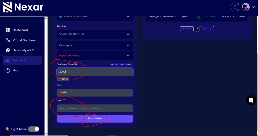 - Input the Quantity ( i.e, the total number of listeners you want to have), Input the correct link then click on the “Place Order” Button to confirm your order.