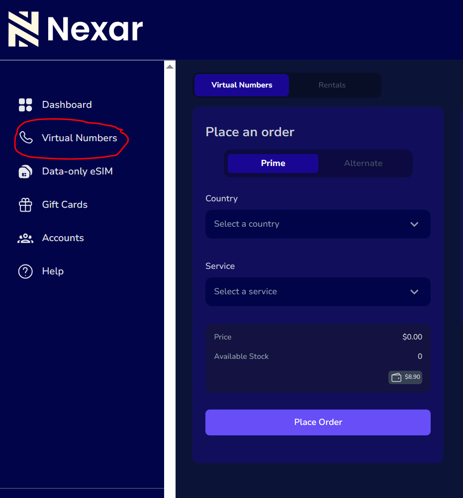 Once logged in, navigate to the dashboard and select Virtual Numbers.