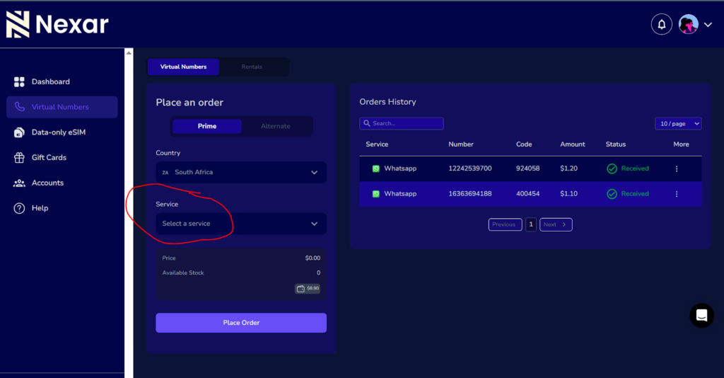 Go to the Virtual Numbers section and choose South Africa from the country list.